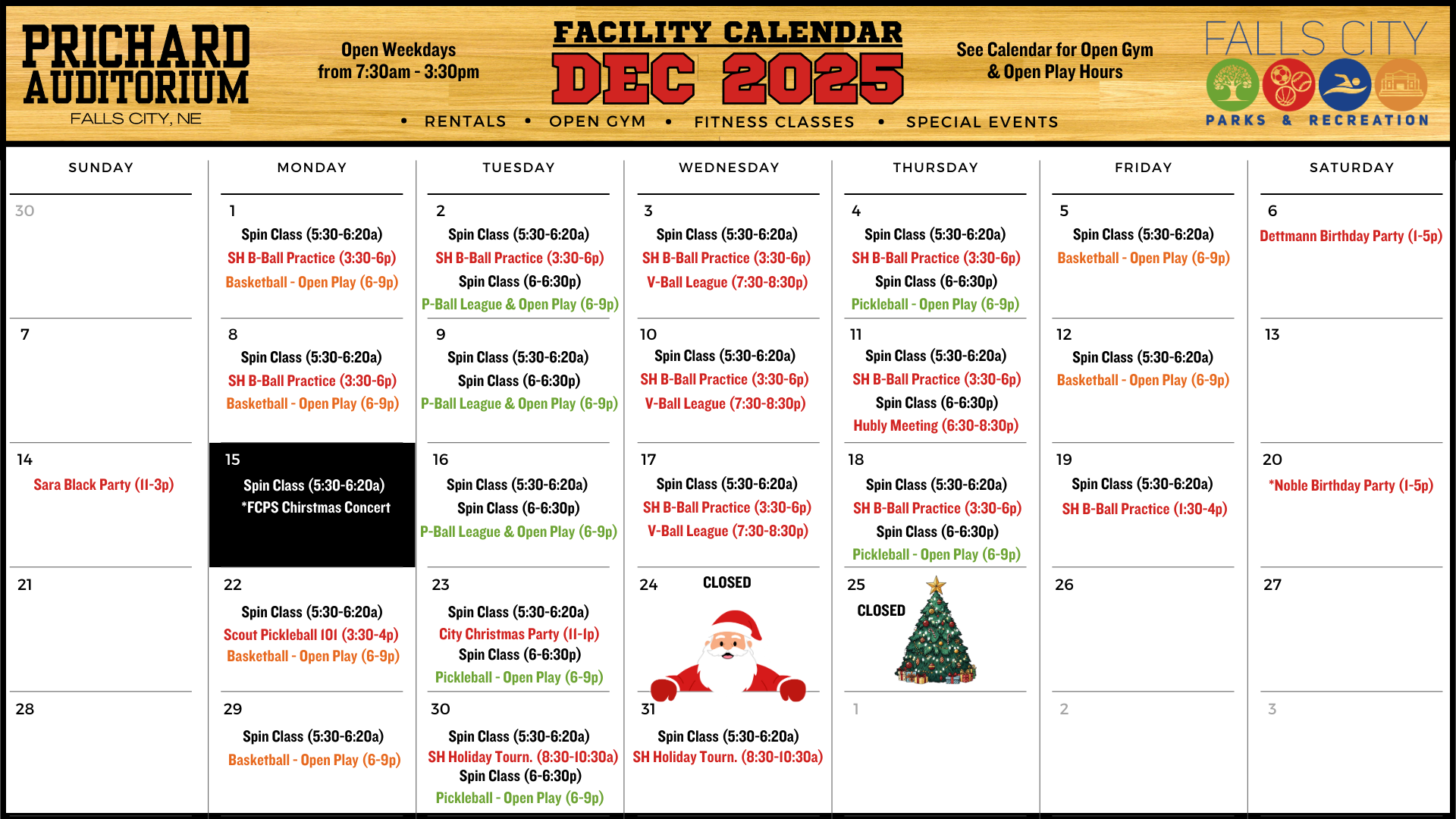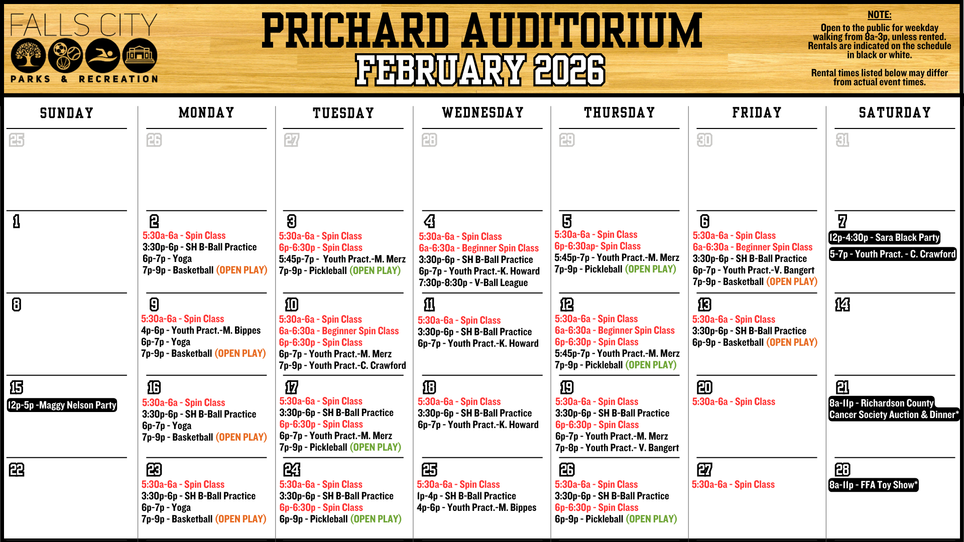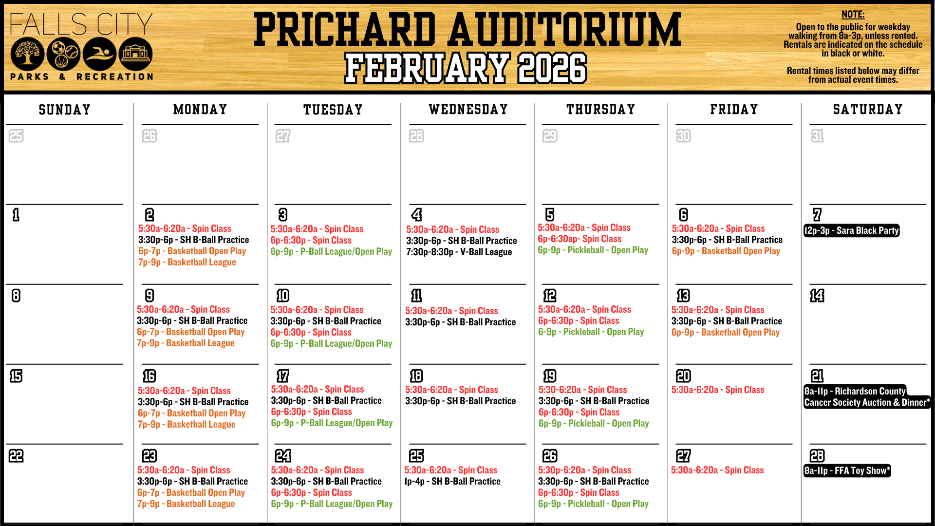 - Sacred Heart and Falls City Public School System basketball and volleyball practices, games and district tournaments